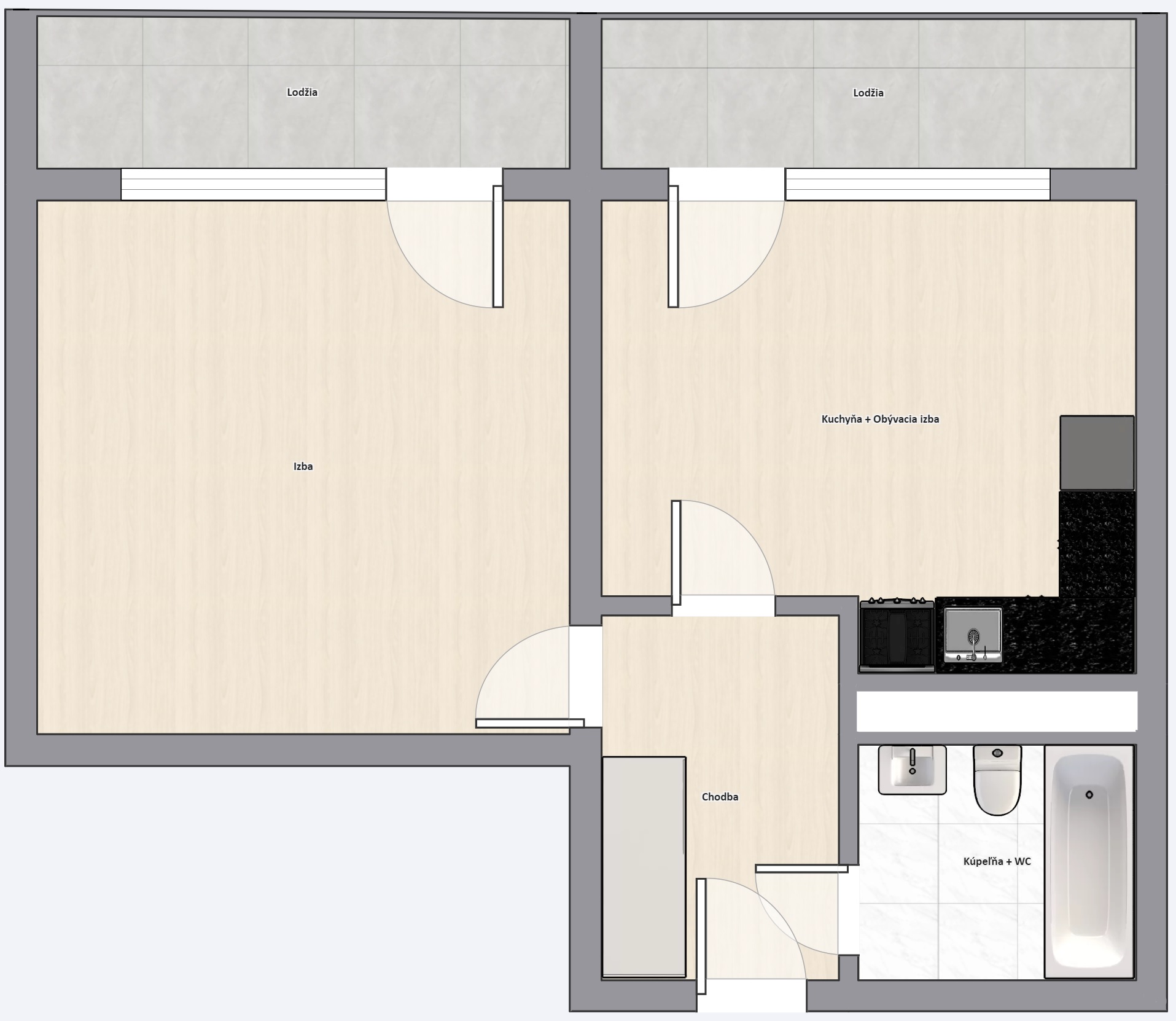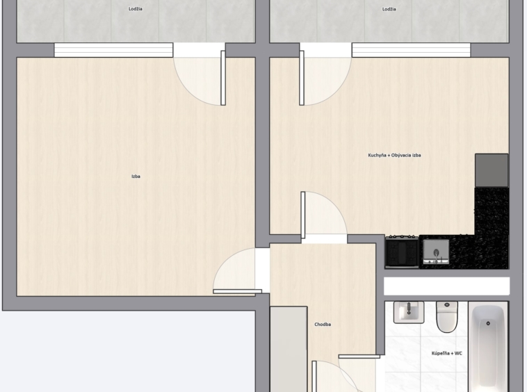 – samostatná izba, kuchyňa, kúpeľňa +wc, chodba, 2x lodžia